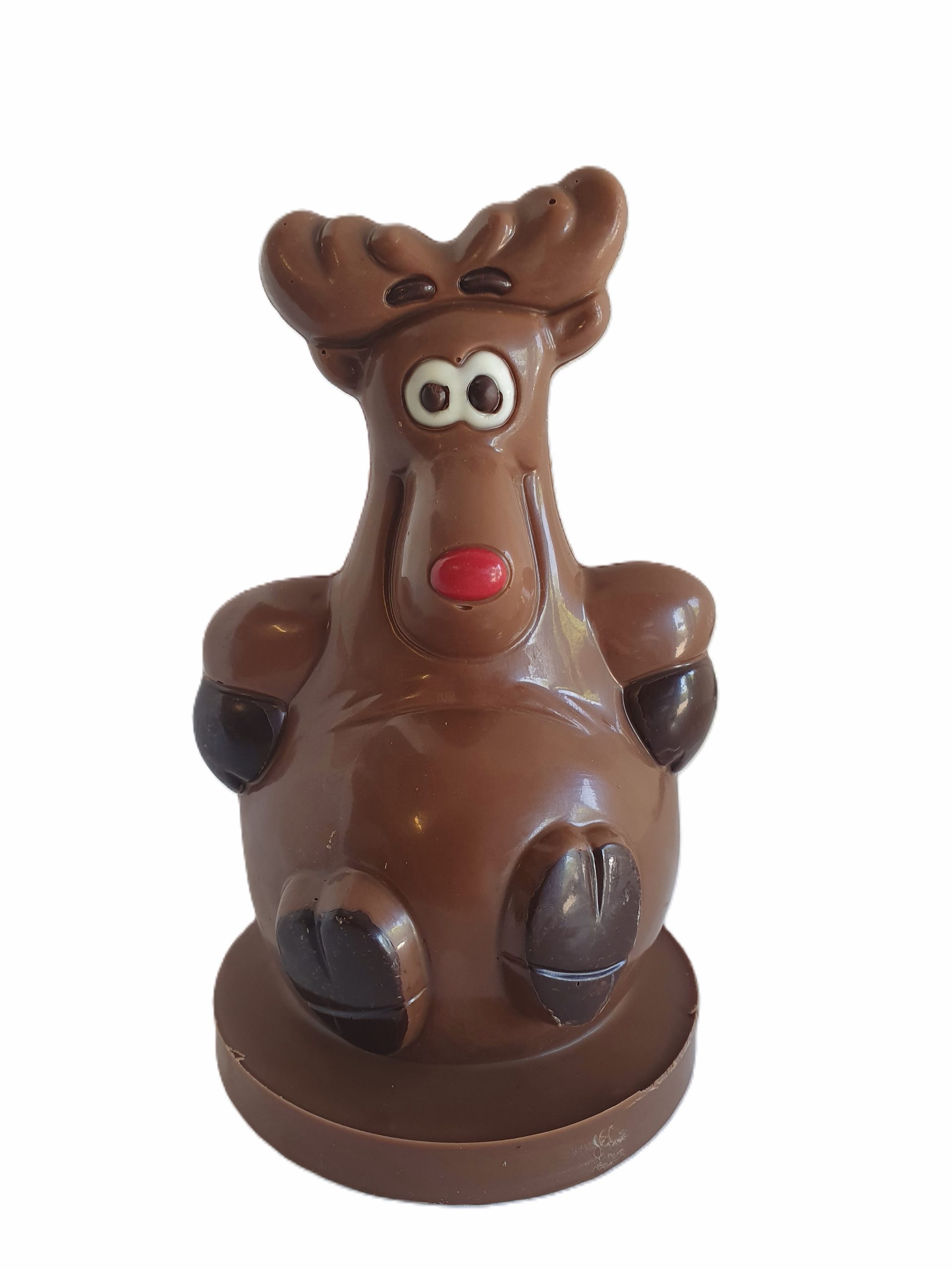 Hand moulded large Big Belly Reindeer in either Milk, Dark or 80% Dark Chocolate.