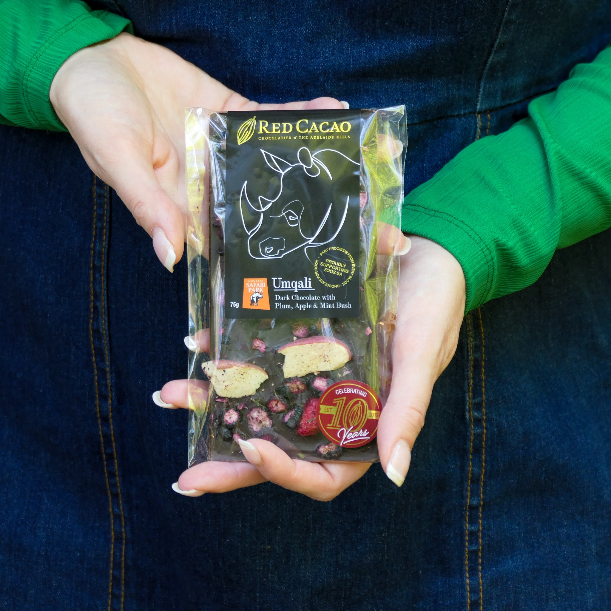Made with this at the forefront we blend our sustainably sourced dark chocolate with Adelaide Hills Apple, Plum and Mint Bush picked from Monarto.